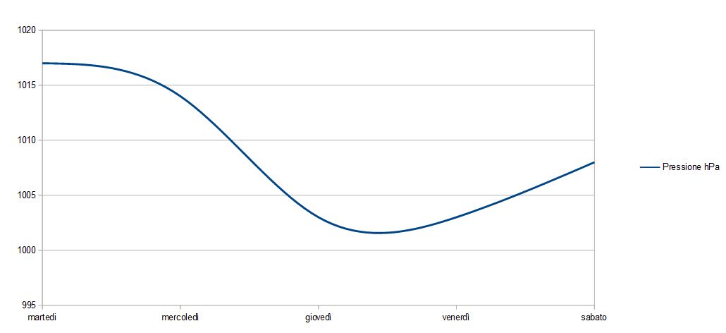 la settimana che ci lasciamo alle spalle è stata moto instabile come avevamo accennato negli scorsi aggiornamenti, ma da ieri la pressione (come si vede dal grafico in foto) sta tornando a salire, annunciando quella che sarà la situazione dei prossimi giorni. In realtà si tratta del classico braccio di ferro stagionale tra ciclone e anti-ciclone. Solitamente dopo una fase ciclonica l’alta pressione prende terreno, come sta accadendo nel caso in esame. Infatti avremo già da domani festa dall’ Immacolata un graduale miglioramento del tempo. Le piogge daranno una tregua e i venti tornano a calmarsi. Per cui ci aspettiamo anche qualche possibile risveglio nebbioso (vi aggiorneremo qualora questa situazione dovesse mai accadere). Allora ricapitolando, pressione in salita, temperature massime che guadagneranno qualche punto positivo ma sembra che le minime non siano così in crescita. Possibili risvegli ancora poco miti. Soleggiamento timido ma possibili aperture con ampie schiarite.