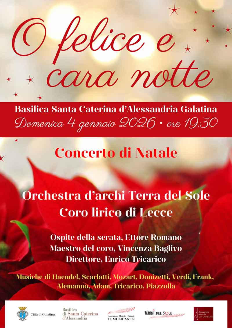 3 Gennaio 2026“O felice e cara notte” è il concerto organizzato domenica 4 gennaio (ore 19:30) dall’associazione di promozione sociale Giovani Realtà di Galatina nella suggestiva cornice della Basilica di Santa Caterina d’Alessandria.