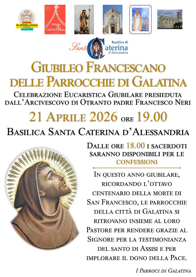 Martedì 21 aprile si festeggia il “Giubileo Francescano delle parrocchie di Galatina”. Alle ore 19, nella Basilica di Santa Caterina d’Alessandria, si terrà la celebrazione eucaristica giubilare presieduta dall’Arcivescovo di Otranto, Padre Francesco Neri.