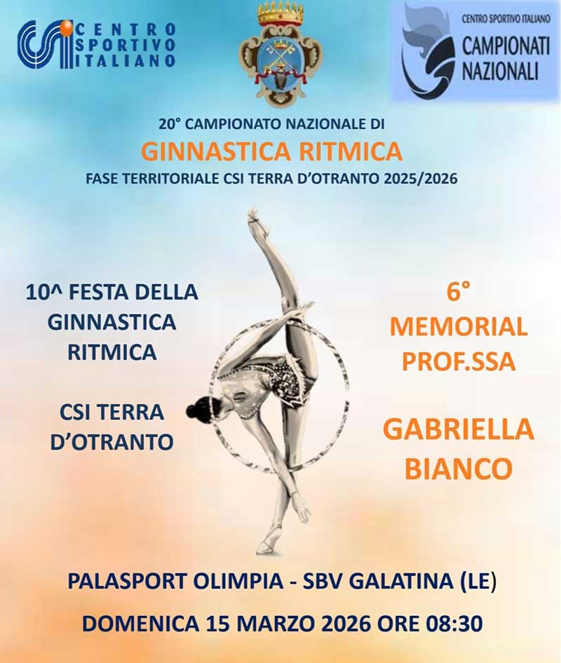 Domenica 15 marzo, il Palasport di Galatina, non ospiterà solo una gara, ma sarà il palcoscenico della fierezza salentina. La fase territoriale del 20° Campionato nazionale CSI di Ginnastica ritmica è il simbolo di un movimento che ha saputo costruire anno dopo anno, un punto di riferimento imprescindibile per lo sport di base e agonistico.