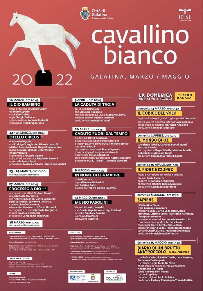 “In continuità con il progetto partecipato sviluppato nel 2021, la programmazione di questa primavera, fortemente voluta, sarà ricca di momenti di condivisione con il Sistema Scolastico cittadino, con le altre realtà che operano nel territorio e con i cittadini – spiega il Direttore artistico Pietro Valenti – ringraziamo l’Amministrazione Comunale e gli Enti pubblici e privati che sostengono il nostro lavoro. La nuova rassegna del Cavallino Bianco fa parte del progetto Meno/Restare, che prevede due approfondimenti su Pier Paolo Pasolini e José Saramago nel centenario della loro nascita. Confidiamo anche quest’anno nella grande partecipazione del pubblico, adulti e ragazzi, per i quali abbiamo previsto anche incontri e laboratori all’interno della rassegna del Tessere e del Trasmettere oltre all’allestimento dell’Odissea di Omero per il Teatro di Comunità”.