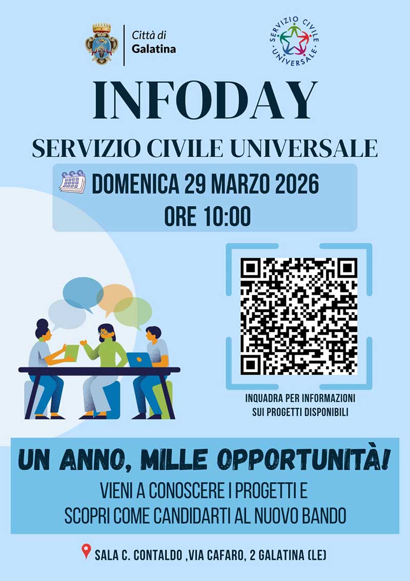 Lo scorso 24 febbraio il Dipartimento per le Politiche giovanili e il Servizio civile universale ha pubblicato il Bando per la selezione di 65.964 operatori volontari in Italia e all’estero, con scadenza alle ore 14:00 dell’8 aprile 2026. Per il Comune di Galatina è prevista la selezione di complessive 28 unità da impegnare in 5 differenti progetti. Pertanto, al fine di far conoscere il bando, i requisiti di partecipazione, le modalità di presentazione delle domande e i progetti disponibili, la Città di Galatina e gli operatori volontari del Servizio Civile Universale attualmente in servizio organizzano un Infoday dedicato al Servizio Civile Universale: un’importante occasione di informazione e orientamento rivolta ai giovani del territorio.