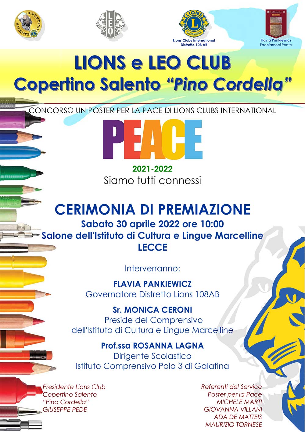 Da oltre tre decenni i Lions Club di tutto il mondo sponsorizzano nelle scuole e presso le organizzazioni giovanili un concorso per opere artistiche molto speciali. Realizzare dei poster sulla pace offre ai giovani di tutto il mondo la possibilità di esprimere il loro modo di vedere la pace, offrendo al mondo l’ispirazione tramite l’arte e la creatività.