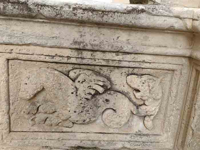 Ma tornando all’esterno, la facciata asseconda l’andamento spezzato dell’architrave correndo sopra i capitelli ornati con foglie di acanto e mascheroni, l’iscrizione recante una parafrasi di un versetto biblico tratto dal Libro dei Proverbi e la data di fondazione. Interessante, al centro, la sirena bicaudata che è simbolo di femminilità e di fertilità. Nel cristianesimo rappresenta anche la duplicità della natura umana (bene-male, ragione-istinto).