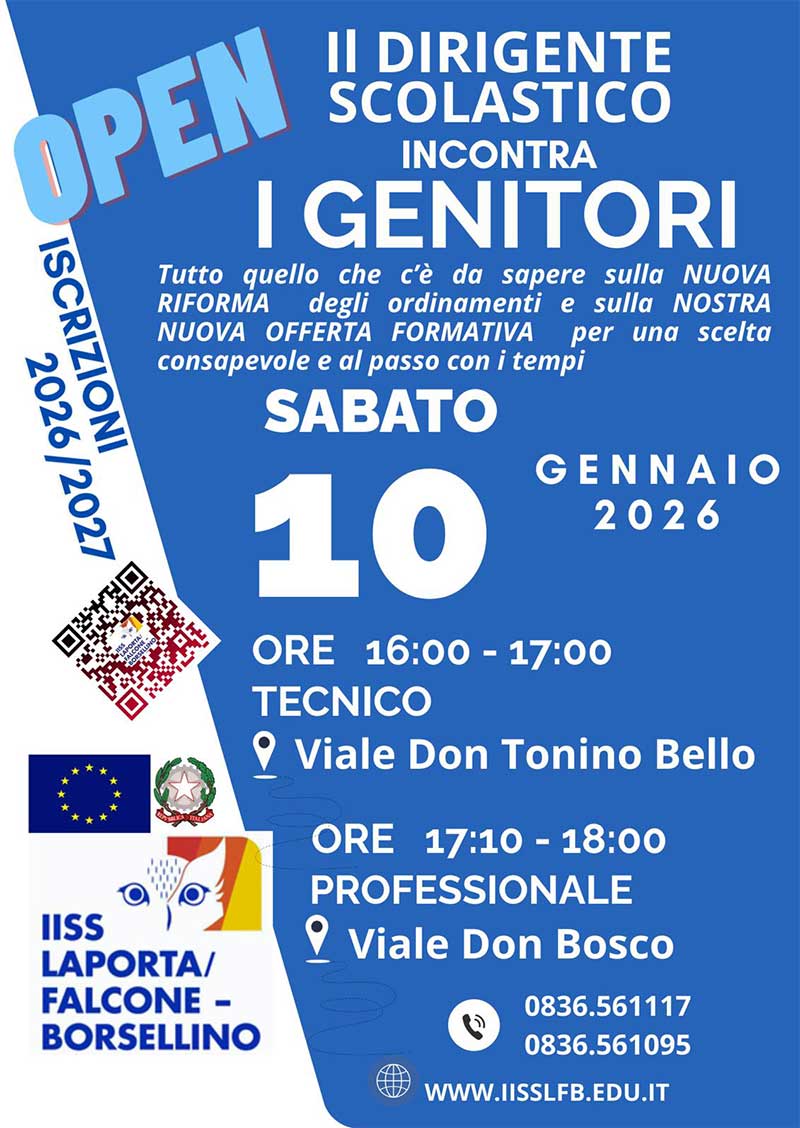 8 Gennaio 2026Sabato 10 gennaio, a partire dalle ore 16.00, presso le due sedi dell’I.I.S.S. “Laporta/Falcone-Borsellino” di Galatina, il dirigente scolastico prof. Vincenzo Melilli incontrerà gli studenti degli Istituti comprensivi del territorio e le loro famiglie.