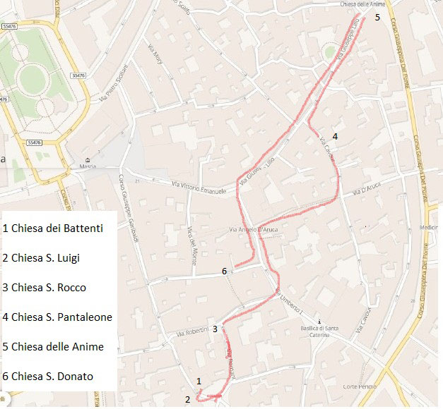 Dalla chiesa dei “Battenti” parte poi un percorso chiamato “Le vie del presepe” che si snoda attraverso le stradine del centro storico di Galatina per visitare i presepi allestiti dalle rispettive Confraternite nelle chiese di S. Luigi, S. Rocco (Ss.mo Salvatore), S. Pantaleone, Anime e, infine, una vera piccola ma preziosa perla sconosciuta ai più, la chiesetta di S. Donato in via Del Balzo.