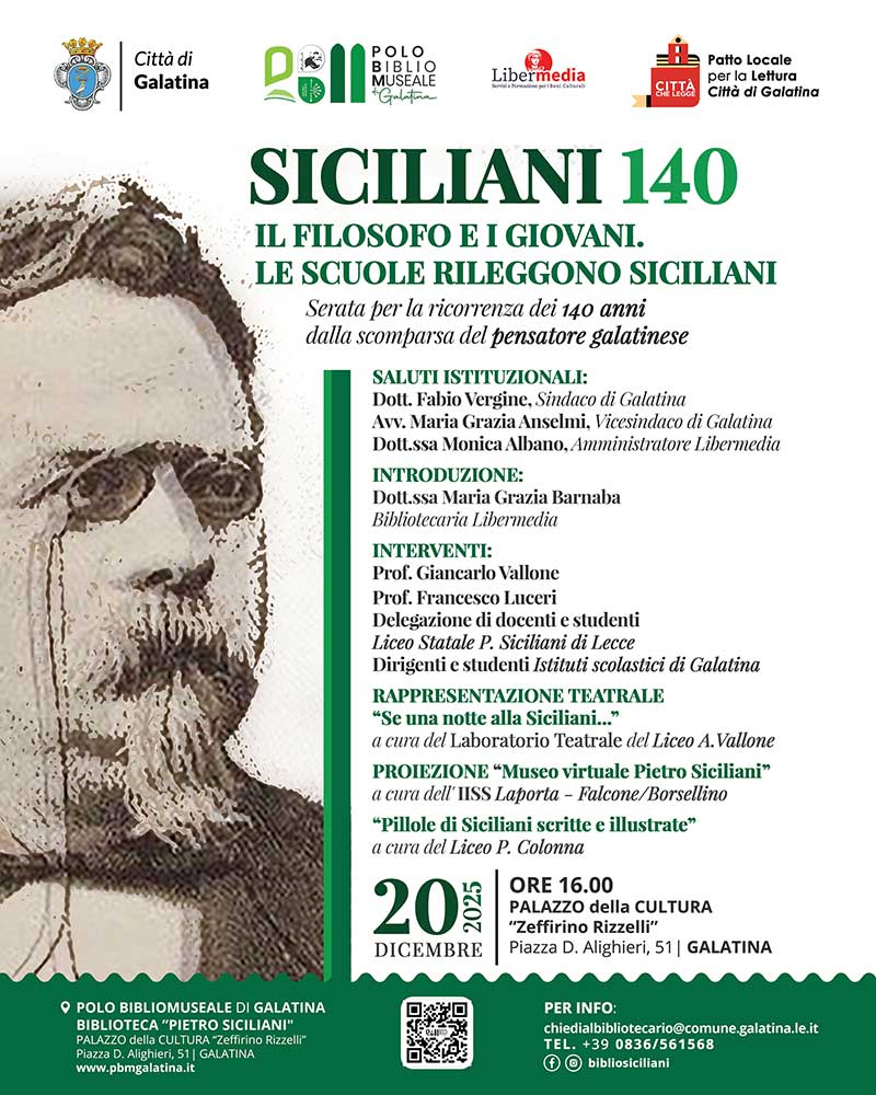 Si aprirà con i saluti istituzionali del sindaco, Fabio Vergine, della vicesindaca, Maria Grazia Anselmi e dell’amministratrice unica della Libermedia, Monica Albano; a seguire, Maria Grazia Barnaba, bibliotecaria della Libermedia, introdurrà la serata, che si articolerà in una discussione sul Siciliani pedagogista e sul suo rapporto con le giovani generazioni del suo tempo. Previsti gli intervento del prof. Giancarlo Vallone del prof. Francesco Luceri, a cui faranno seguito i contributi di docenti e studenti del Liceo Statale “Siciliani” di Lecce e degli Istituti superiori di Galatina (Liceo “Colonna”, Liceo “Vallone, IISS “Laporta-Falcone/Borsellino”). Chiuderanno l’iniziativa le studentesse e gli studenti dei vari Istituti superiori della città, che illustreranno il risultato finale del lavoro di rilettura dell’opera di Pietro Siciliani, svolto nelle proprie classi, guidati dai rispettivi docenti. Un lavoro che ha permesso di conoscere ed approfondire la figura del filosofo galatinese, interpretandolo con gli occhi e la mente della loro generazione.