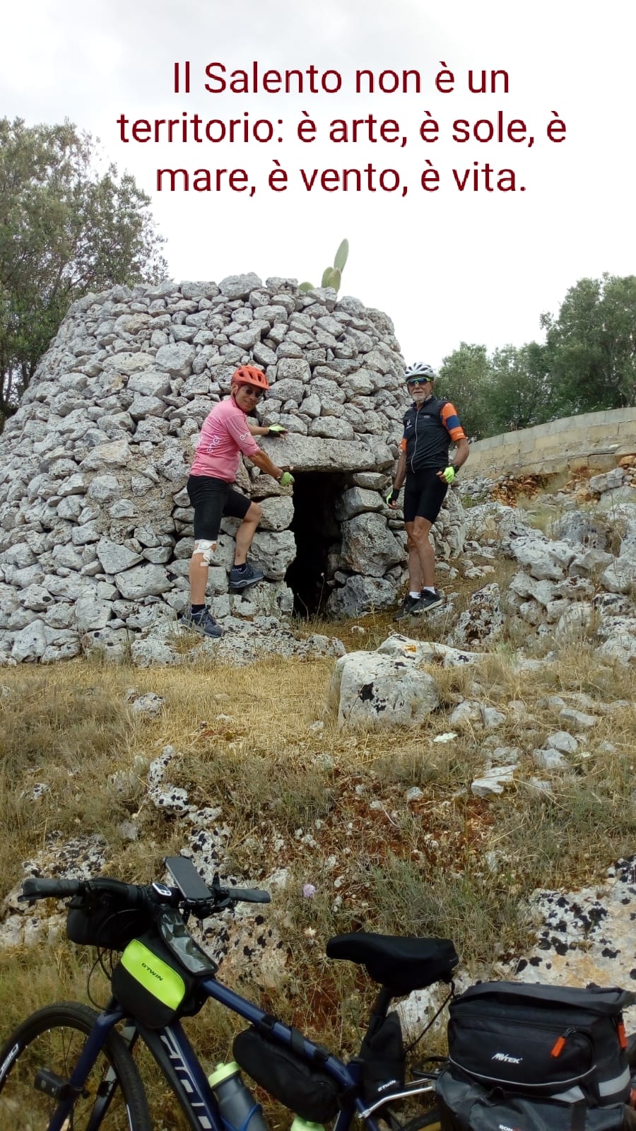 “Partenza da Galatina alle ore 7:15. Prima destinazione Otranto, ma prima di arrivare mi si è incastrata la ruota anteriore nei binari della ferrovia con conseguente caduta e deformazione della ruota. Rapidamente sostituita da un meccanico presente in zona. Abbiamo ammirato il castello aragonese, la splendida cattedrale con il pavimento completamente a mosaico e la bellissima cripta. Poi siamo giunti a Cerfignano dove siamo stati ospiti di una manifestazione di fine anno scolastico per i bambini della scuola primaria ed organizzata da Don Pasquale, padre spirituale del CSI di zona. Abbiamo presentato a tutti i presenti, insegnanti e genitori, il nostro tour e condiviso il pranzo. Il percorso fino a Santa Maria di Leuca è stato un continuo susseguirsi di panorami mozzafiato sul mare, sulle baie, sulle grotte e sulle insenature. Ecco l’arrivo a Finibus Terrae, un balcone naturale sulla città”.