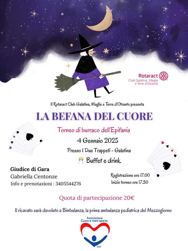 Giocare insieme per regalare un futuro migliore. “La Befana del cuore” è il torneo di burraco solidale organizzato dal Rotaract Club Galatina Maglie Terre d’Otranto domenica 4 gennaio, alle ore 17, presso I Due Trappeti in via Roma a Galatina.
